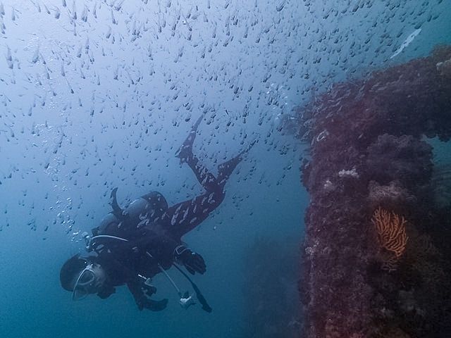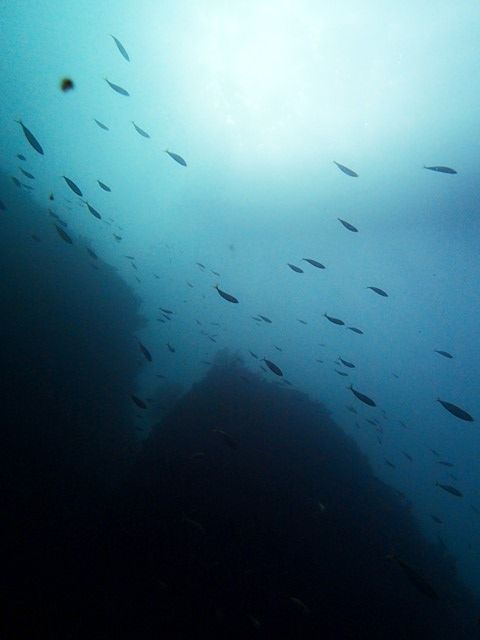 クエ、コロダイ、ハタ、サクラダイ、ネンブツダイの幼魚、アジの群れ、イシガキダイ、ミノカサゴ、ヒロウミウシ、キイロウミウシ、ニシキウミウシ、ヒラメなど。今日はいい天気で、魚礁の下から上を見ると、水面がキラキラしていました(*^_^*)
