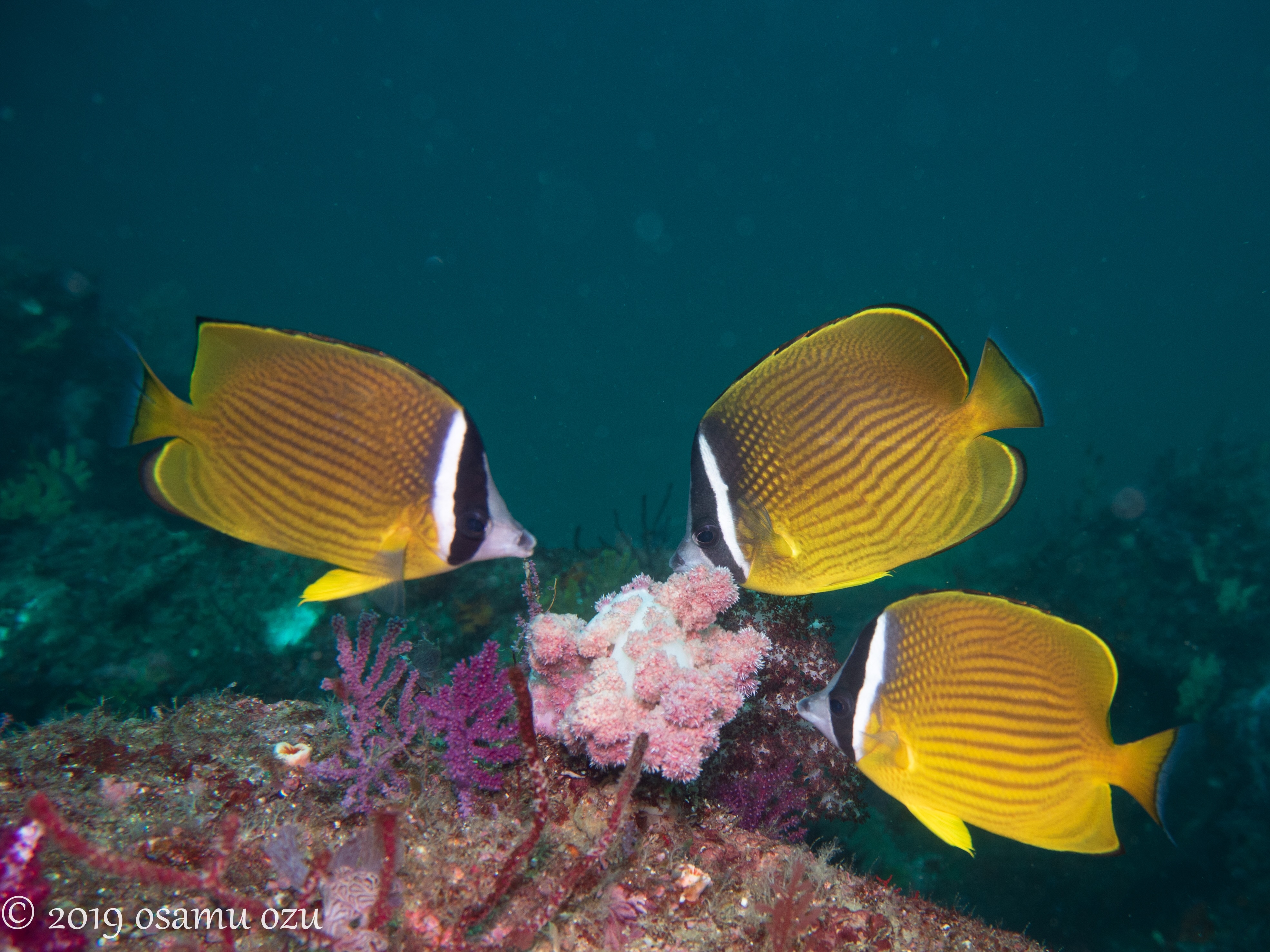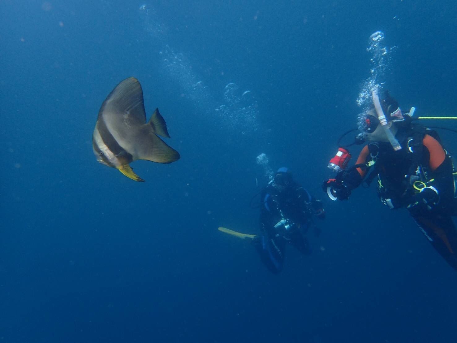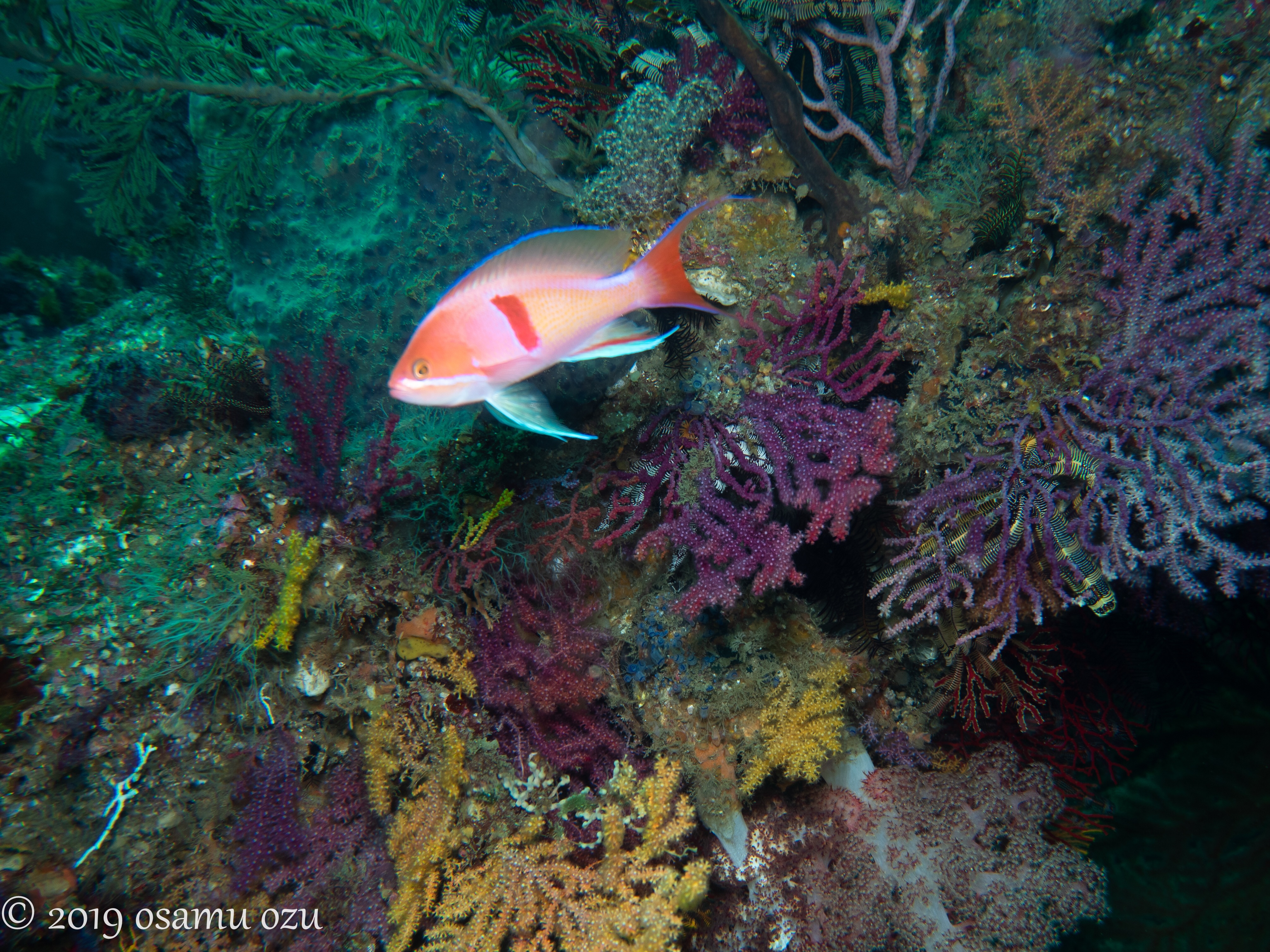 2019年08月20日 オワセブルー到来 ♪ 海況データ:水温22.5〜28.0℃ 透視度10m 凪台風後、私は初めての尾鷲となります。そして、オワセブルー到来です‼️魚礁、一ツ石ともに、透視度10mオーバーで、水底から船底が見えます。水深18m付近までは水温26℃と快適💕しかし、それより深いと一気にに22.5℃です…※ツバメウオ S様の撮影こんな感じで青いですよーこのツバメウオ、台風の荒波を耐えたようです。魚礁はハナダイが輝きが目立ち、季節は確実に秋に向かってます。(*´-`)サクラダイのトランスジェンダー、雄の白点と、雌の黒点が混在してます。キンギョハナダイの雄、凛々しいーウイゴンベの幼魚、一ツ石のアヤトリカクレエビ雌、何処に居るか分かりますか?根の上にイソギンポが、いい場所に居てますよ💕ネタいっぱいの尾鷲で、お待ちしております‼️伊藤